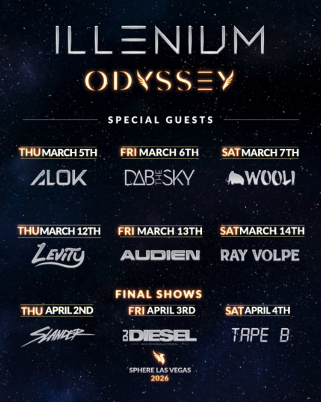 The momentum sets the stage for what will be one of the biggest years in ILLENIUM’s career. Up next, ILLENIUM will release his highly anticipated album ODYSSEY on February 6, 2026, a body of work that ushers in a new era of emotional storytelling, maximalist production, and expansive sonic world-building. To celebrate the release, ILLENIUM will be performing an album release show in San Francisco at Pier 80 Warehouse on Thursday, February 5th, the day before the album is out. Tickets go on sale at 12pm PT today. Get them HERE. Following the album release party, ILLENIUM will have a nine-night run of ODYSSEY shows at Sphere March 5, 6, 7, 12, 13 & 14 and April 2, 3 & 4. These shows mark the only opportunity for fans to experience ODYSSEY live.