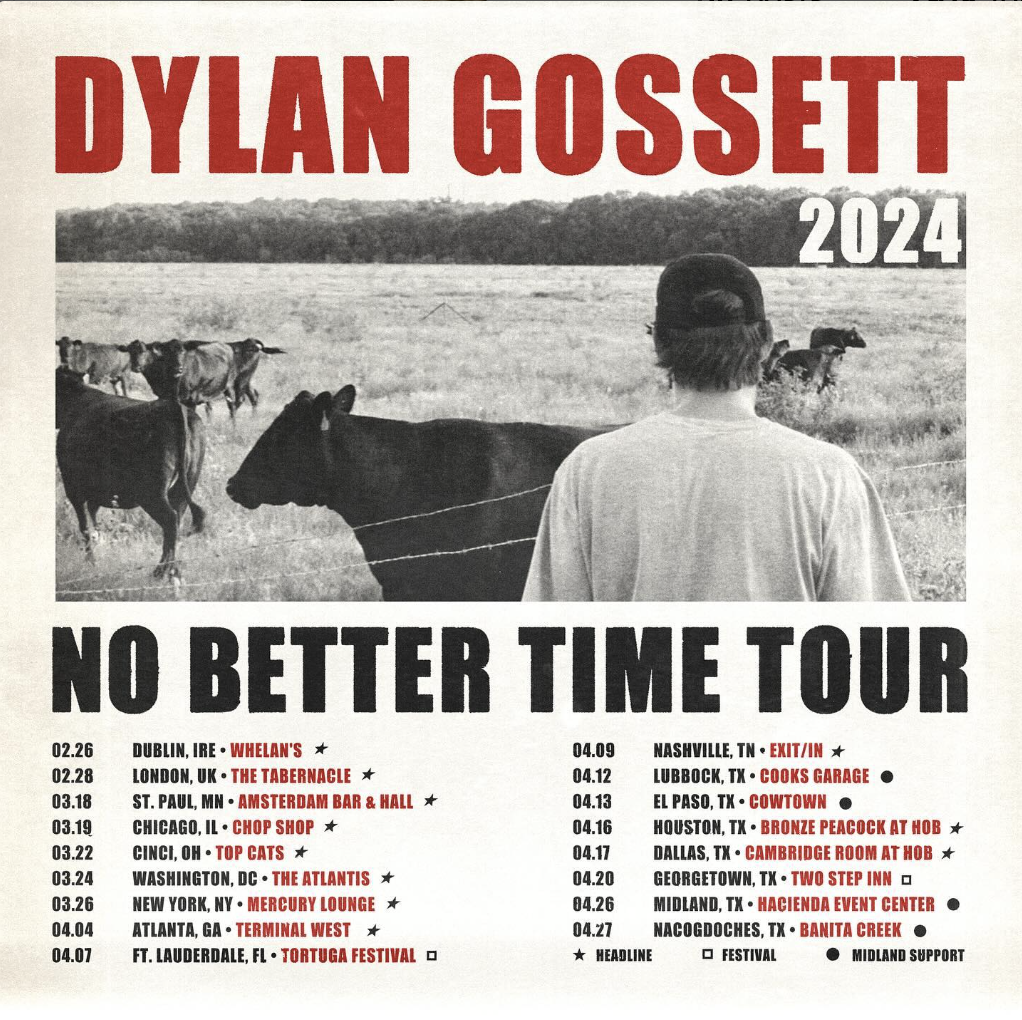 Songs In The Gravel is the follow-up project to Gossett’s 2023 critically acclaimed, debut EP No Better Time, which cemented the Austin native as an artist to watch in 2024. Written, recorded, produced, and mixed by Dylan himself in his bedroom, No Better Time showcases the breadth of his talents. The EP includes his breakout smash hit single “Coal” and fan favorite tracks “Beneath Oak Trees” and “Flip A Coin.” Beyond recently debuting on the Billboard Hot 100 (Gossett’s first career entry), “Coal” is now Certified Gold in the US, Canada, and Australia with over 150 million global streams to date and recently shot back into the Spotify Top 200. Globally, “Coal” continues to shine as it charted on the Official Singles Chart Top 100 in the UK and reached the Top 5 on the Country Radio Chart in Australia.